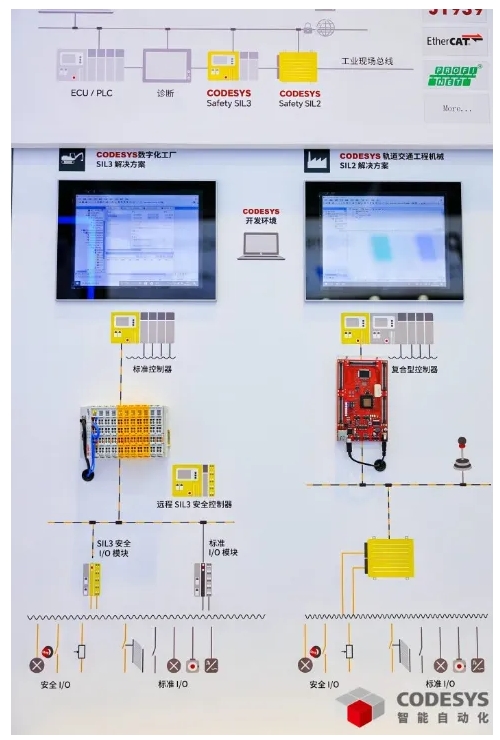 CODESYS Safety SIL 3(功能安全控制) 可用于工廠自動(dòng)化領(lǐng)域,支持用戶開發(fā)符合 SIL 3 國際標(biāo)準(zhǔn)的安全控制器;CODESYS Safety SIL 2 (功能安全控制)則用于開發(fā)符合 IEC 61508 和 EN 13849 PLd 標(biāo)準(zhǔn)的安全控制器,應(yīng)用于工程機(jī)械和特種車輛等領(lǐng)域。同時(shí) CODESYS 支持用戶使用 CODESYS EtherCAT 功能安全模塊開發(fā)實(shí)現(xiàn)功能安全目標(biāo)的 Safety 安全控制系統(tǒng)。