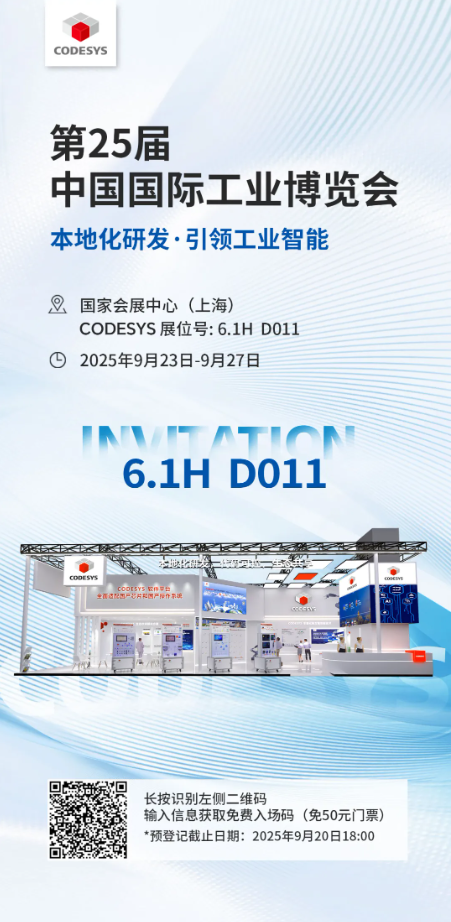 我們誠(chéng)摯地邀請(qǐng)您蒞臨 CODESYS 展位(展位號(hào):6.1H D011),親身感受 CODESYS 的創(chuàng)新魅力,共同探討工業(yè)自動(dòng)化的未來(lái)發(fā)展之路。讓我們攜手共進(jìn),在2025年中國(guó)國(guó)際工業(yè)博覽會(huì)上,開(kāi)啟一段精彩紛呈的工業(yè)之旅!